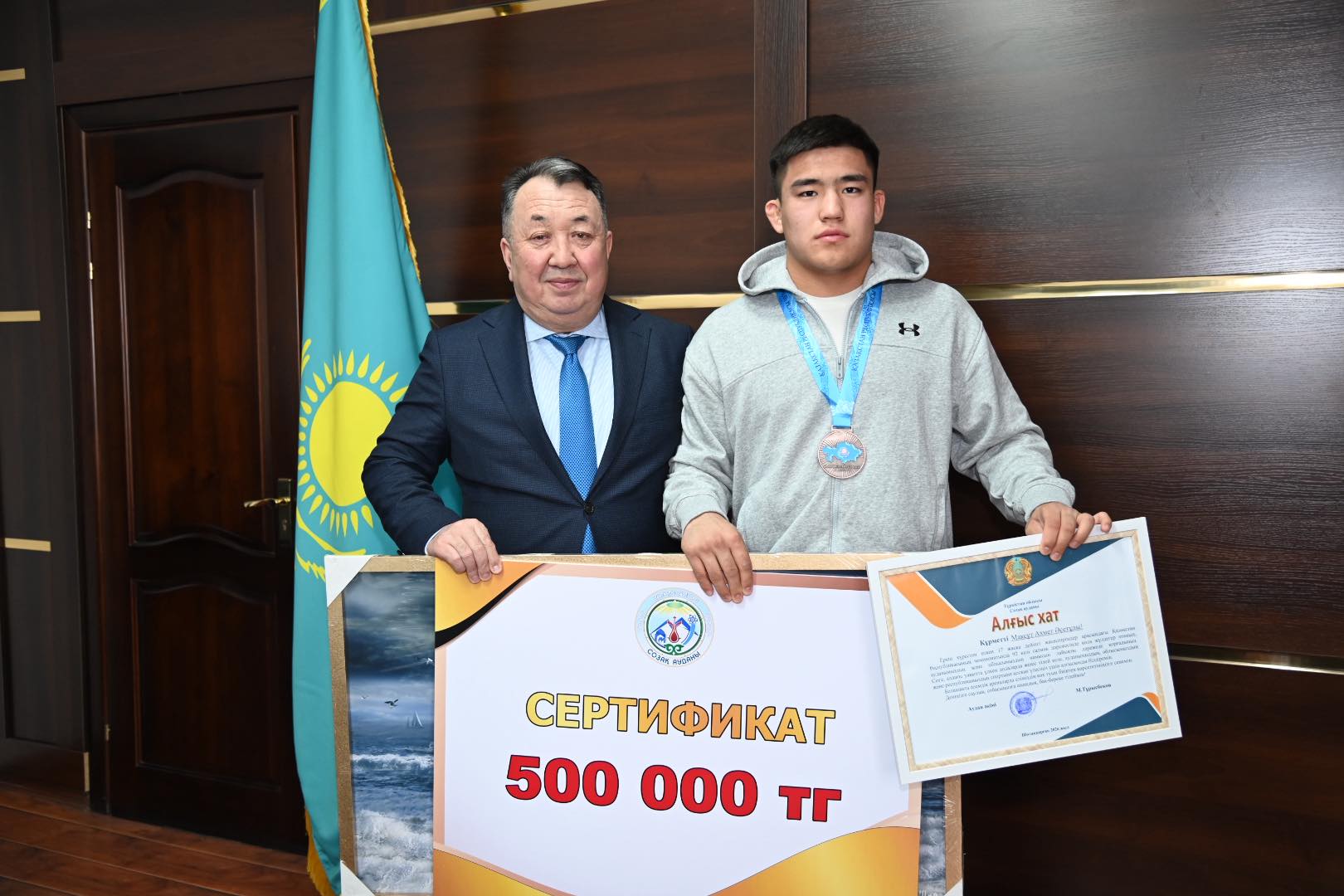 Қабылдау соңында жас спортшы мен оның бапкеріне арнайы Алғыс хат пен сый-сияпаттар табыс етіліп, құрмет көрсетілді.