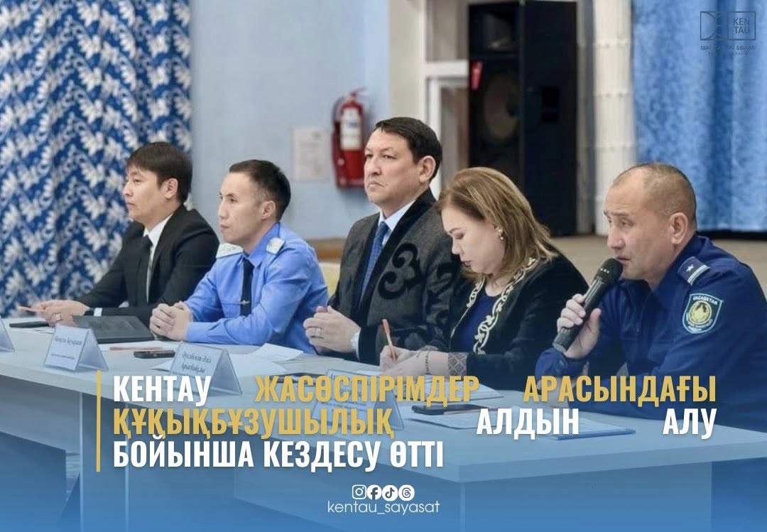 Жиынға қалалық прокуратура өкілі, Кентау қалалық полиция бөлімінің өкілдері және қалалық білім бөлімінің жауапты мамандары қатысты. Кездесу барысында полиция қызметкерлері мен білім саласының мамандары жасөспірімдер арасындағы құқықбұзушылықтың алдын алу, құқықтық мәдениетті қалыптастыру мәселелері бойынша баяндама жасап, түсіндіру жұмыстарын жүргізді.